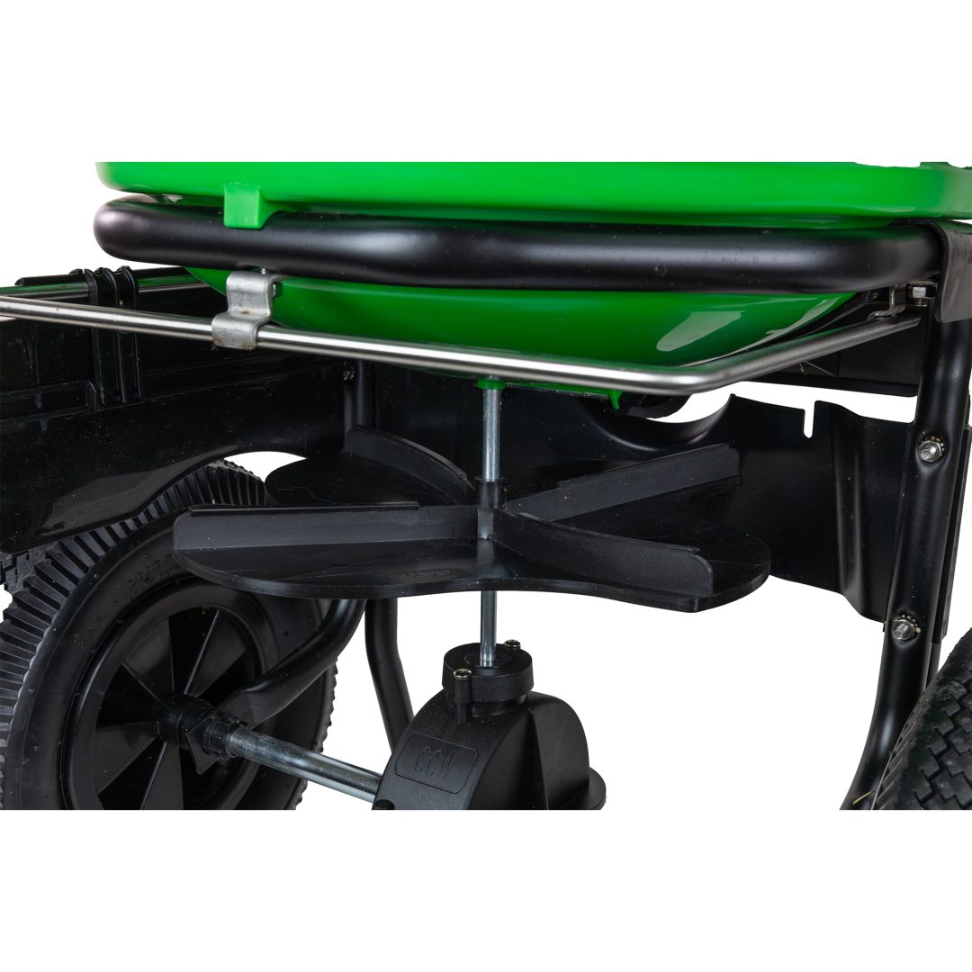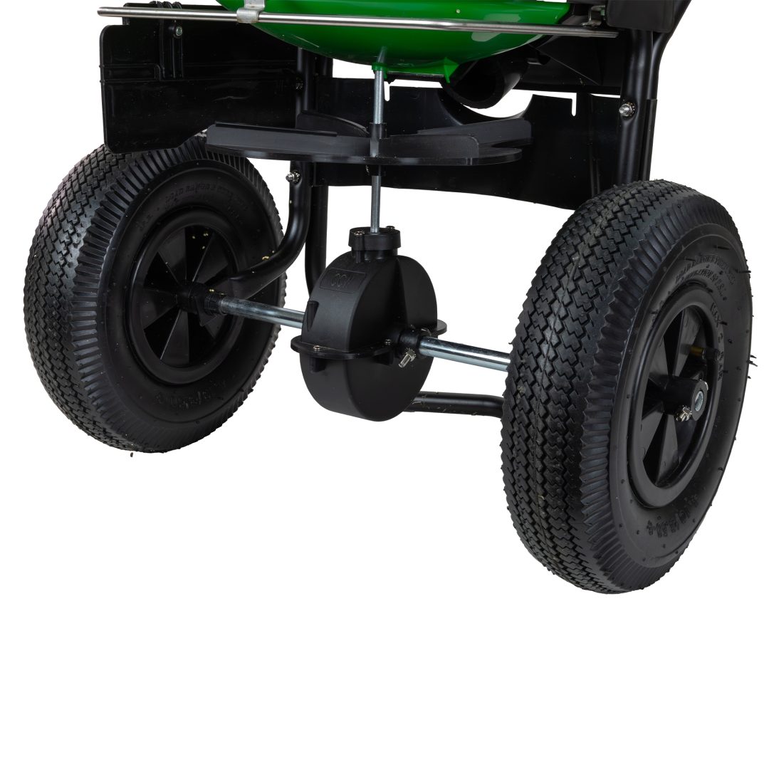 80 lb. capacity hopper and 12" wide pneumatic tires